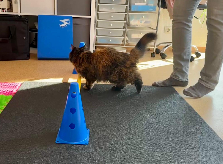 Die Übungen werden spielerisch, stressfrei und katzenfreundlich gestaltet – z. B. über motivierende Bewegungsanreize, sanfte Mobilisation und kurze, effektive Trainingseinheiten. Spielerisches Weiterüben zuhause ist besonders bei Katzen sehr wichtig.